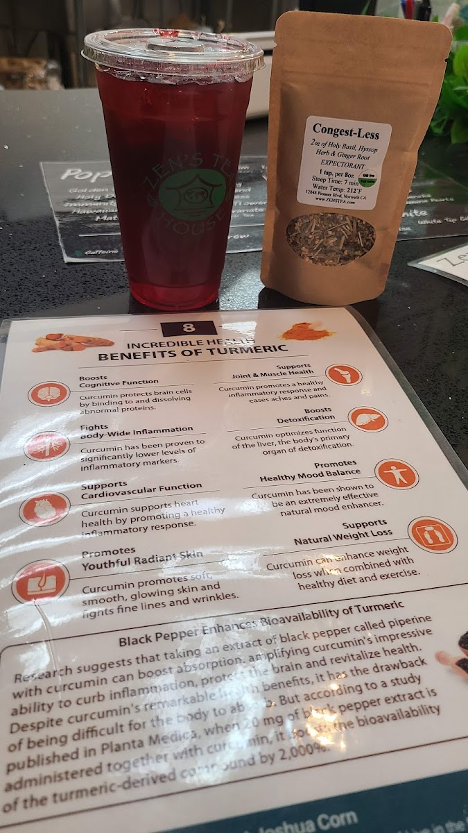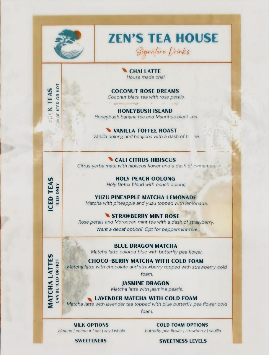 At Zen's Tea House, the menu is a delightful blend of handcrafted teas, specialty lattes, and light bites that reflect its focus on organic loose‑leaf offerings. Signature beverages include the Golden Milk Tea - $6.00, a warm blend of turmeric, ginger, and cinnamon, the tropical Hawaiian Fruit Tea - $6.00, the floral Dream of Flower - $6.00, and the calming Matcha Green Tea - $6.00, alongside favorites like Organic Thai Tea - $6.00 and Peach Oolong Tea - $6.00. For something effervescent there’s also Kombucha on Tap - $7.00. Customers can enjoy freshly prepared drinks such as the creamy Golden Milk Latte - $6.99, classic Thai Milk Tea - $6.00, and a variety of milk teas like Dream of Flowers Milk Tea - $6.00 and Matcha - $6.99 from local delivery menus. To pair with tea, the house offers a simple selection of Fresh Bagels - $3.00 in several flavors. Taken together, the menu balances wellness‑inspired teas with comforting, flavorful options at approachable price points.